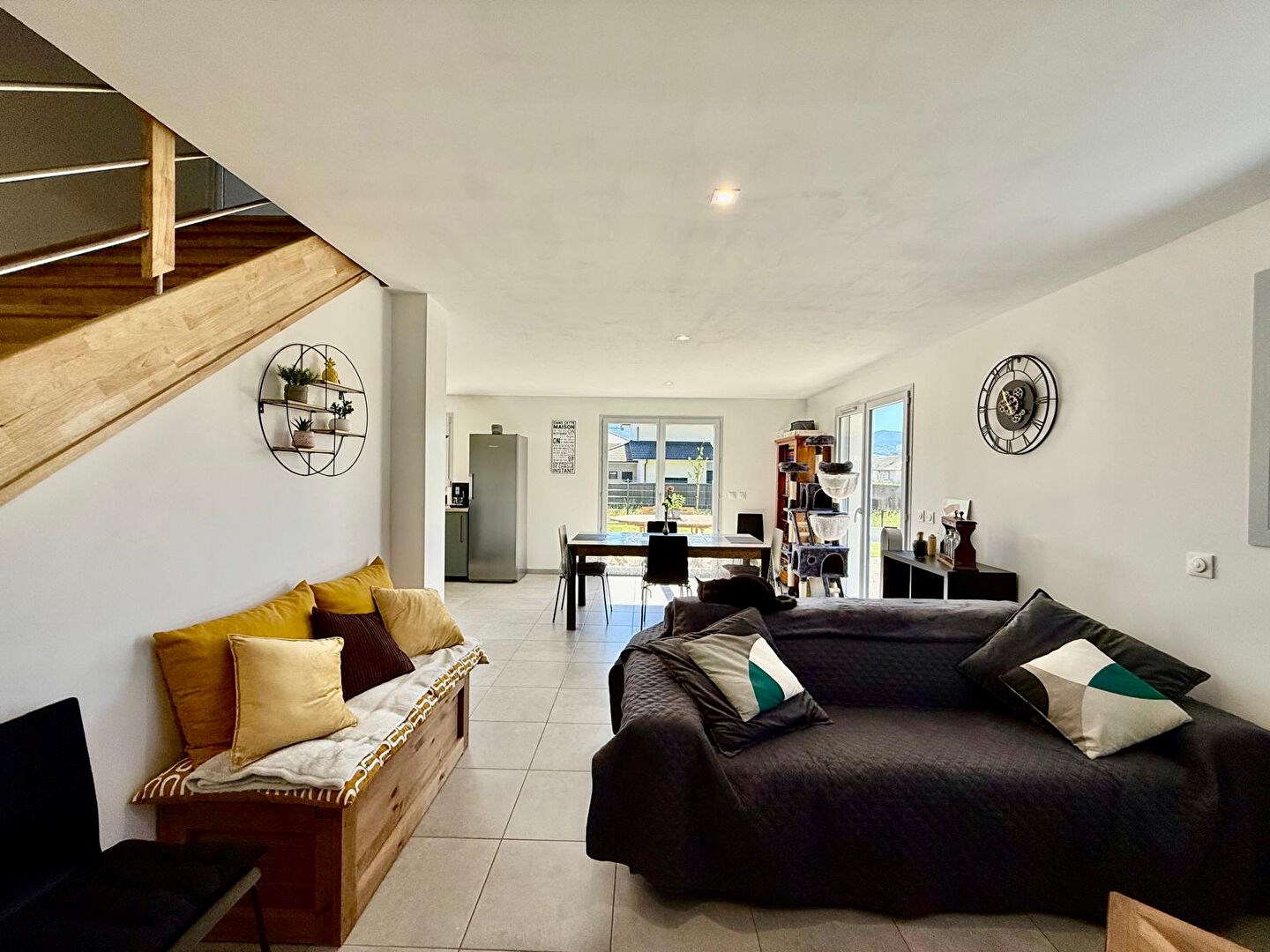 Vous découvrirez au rez-de-jardin une pièce de vie lumineuse composée d'une cuisine ouverte sur le séjour et la salle à manger, avec un accès direct à la terrasse et au jardin, parfaits pour vos moments de détente en extérieur. Une buanderie et un WC viennent compléter ce niveau pour plus de praticité.